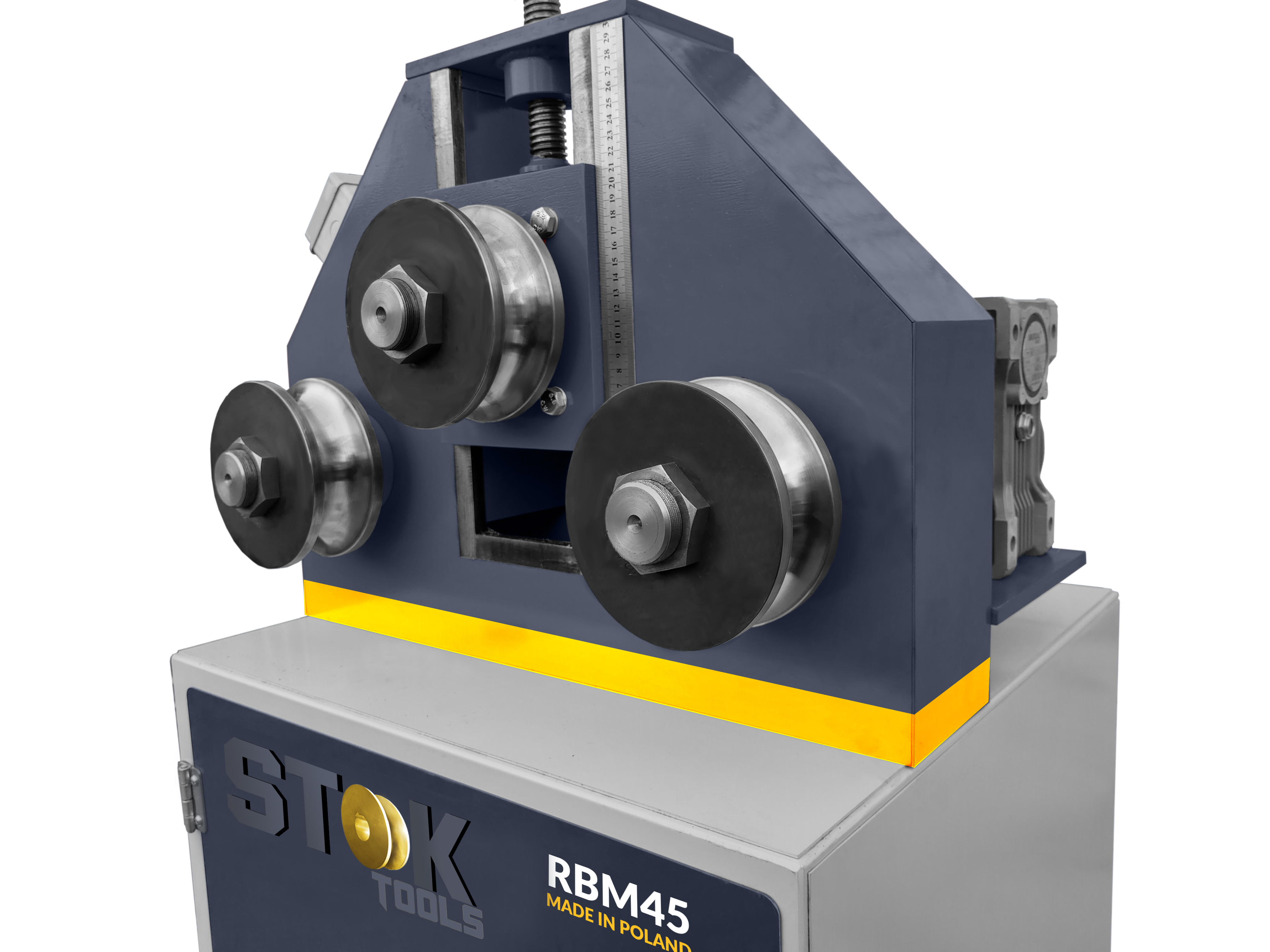 Najbardziej wyjątkową cechą RBM 45/1 jest to, że posiada układ ręczny docisku górnej rolki oraz napęd dolnych rolek przez motoreduktor. Dzięki czemu zakres roboczy giętarki umożliwia gięcie rur o wymiarach 50x2,0 mm.