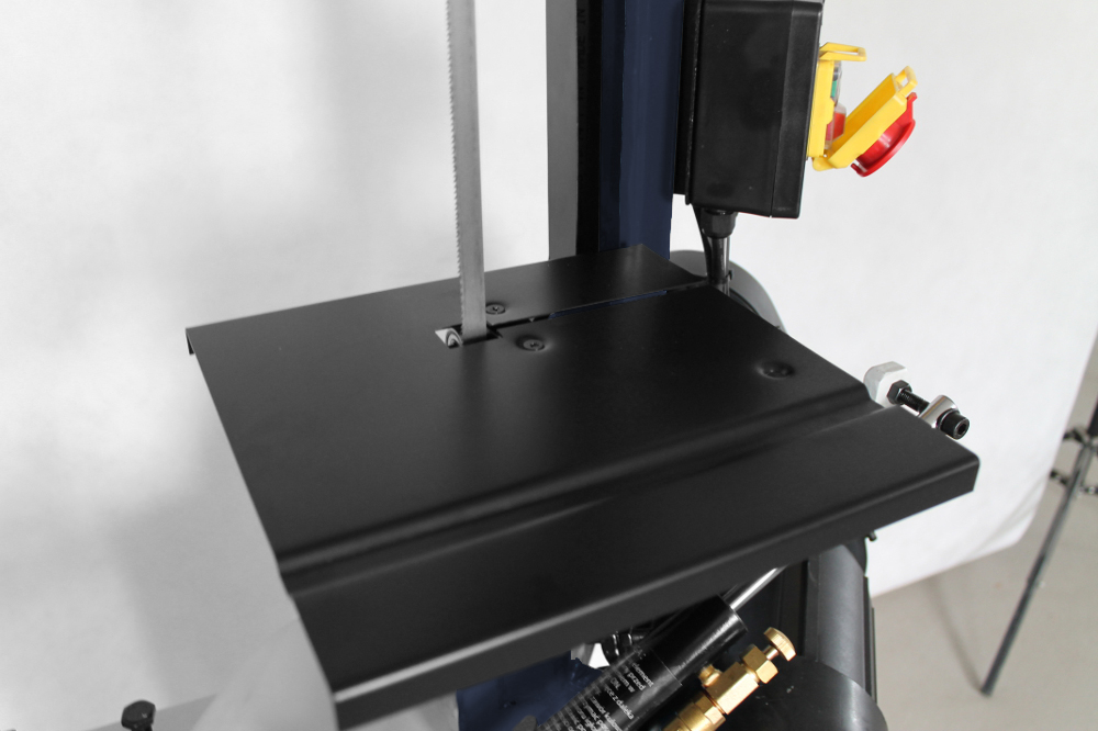 Bezpieczeństwo zapewnią osłony taśmy tnącej oraz mikro wyłączniki zatrzymujące pracę silnika po zakończeniu cyklu ciecia lub otwarciu którejkolwiek z osłon.