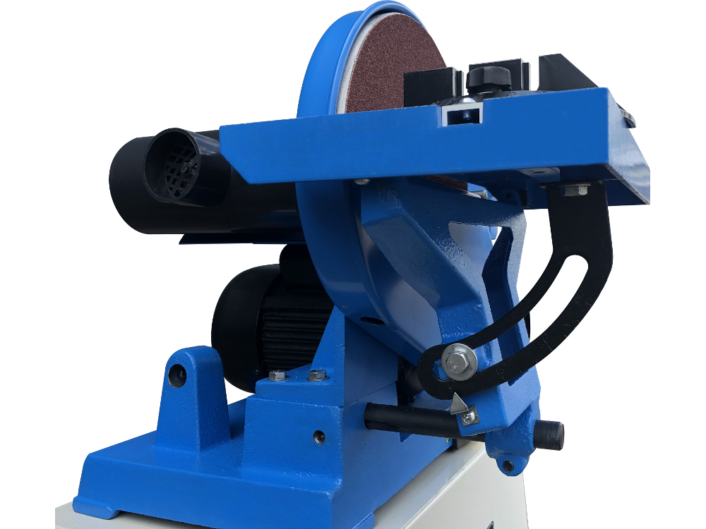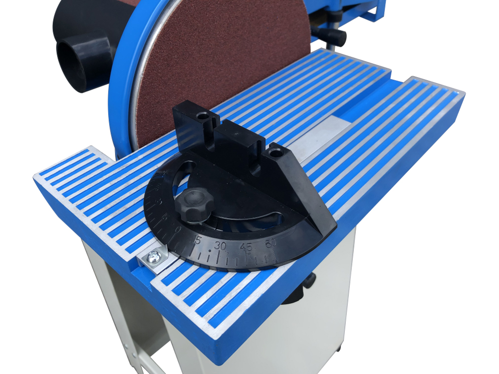 - Stół prowadzący wyposażony został w prowadnicę z podziałką kątową. Stół może być montowany do szlifierki tarczowej jak i do szlifierki taśmowej postawionej do pionu.