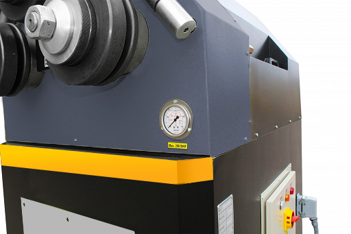 Maszyna ta dodatkowo wyposażona została w hydrauliczny docisk rolki górnej, co daje nam świetne rozwiązanie przy gięciu łuków, spirali, okręgów itd. Masa własna maszyny – stalowa konstrukcja – daje nam optymalną stabilność w czasie pracy.